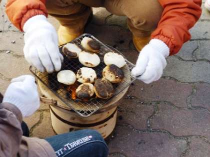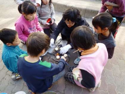 四苦八苦しながら,やっと火をおこすことができたところで,いよいよお餅ちを焼きます。今日のおもちは,卒業祝いもちつき大会で,3年生ために余分についていただいたお餅です。