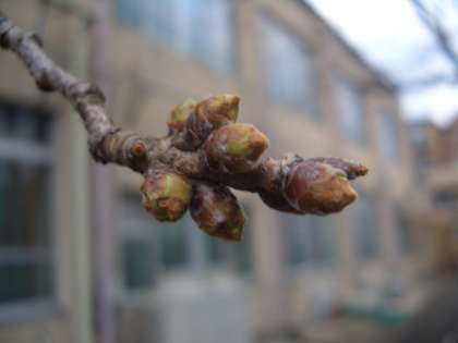 桜だより,はじめます。つぼみも膨らんできています。今日は昨日とうってかわって寒い一日となりそうです。昨日,福岡でソメイヨシノの開花が見られたそうですが,今年の開花は早いかもしれませんね。