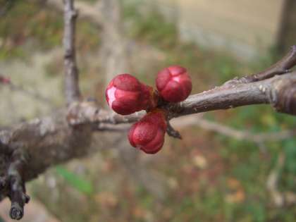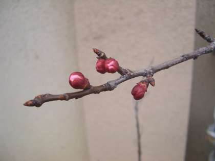 紅いつぼみがついています。桜でも梅でもありません。なんのつぼみでしょう。策とわかるかな,それとも実ができるとわかるかな?