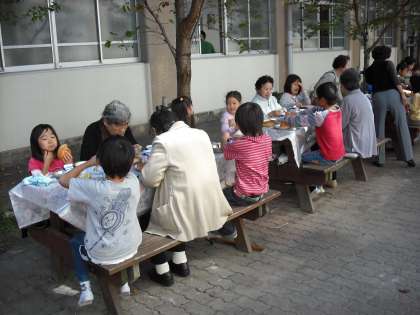 今日のすこやか学級さんの昼食は学校給食です。秋晴れのもと,中庭の野外テーブルで1年生と仲よし学級のみんなと一緒に食べています。給食のお味はいかがでしょうか。