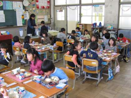 1年生にとっては今日がはじめての学校給食です。6年生のお兄さん・お姉さんに手伝ってもらいながら,やっぱり時間がかかりましたが,きちんと準備することができました。おかずはスパゲッティ,人気のメニューです。