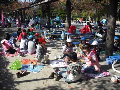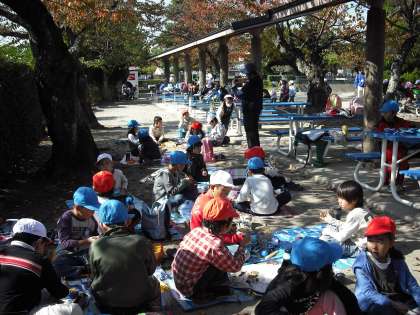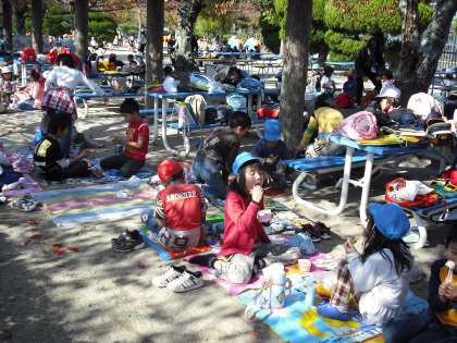 探検で走り回って,みんなおなかがぺこぺこです。お弁当タイム,みんなおいしそうにお弁当を食べていました。