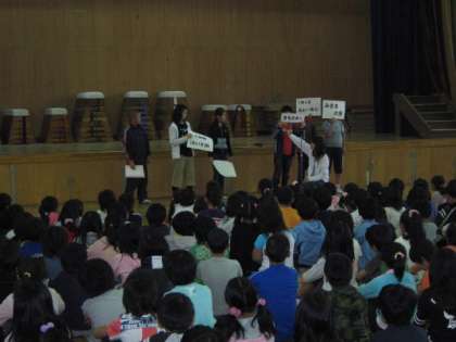 校長先生からは,紅葉の美しいこの季節に「美しいものを美しいと思える心—感性」を磨くために読書が大事という話がありました。そのあと,前回インフルエンザのために延期になった5年生の「みさきの家」の発表がありました。