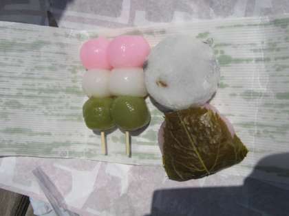 暖かい陽射しの中,のんびり散歩しながら,賀茂川へお花見にいってきたよ。ピンクの桜と青い空,若葉の緑が,とても美しかったよ。花見だんごはどうしたのかな?