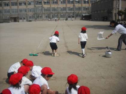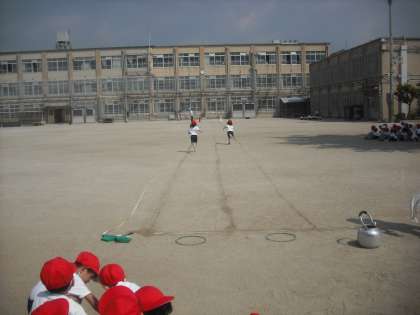 体育の時間に,初めて50m走のタイムを計りました。みんな一所懸命です。速く走れたかな?これは,体育の学習でもあり,運動会をはじめ,全校縦割りグループを作る目的もあります。