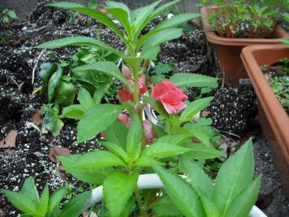 夏の花,ホウセンカが咲いています。種がはじけて,それが発芽したものです。同じようにこぼれ種から発芽したホウセンカはいっぱいありますが,急な冷え込みでこれから花を咲かせるのはちょっと難しそうですね。