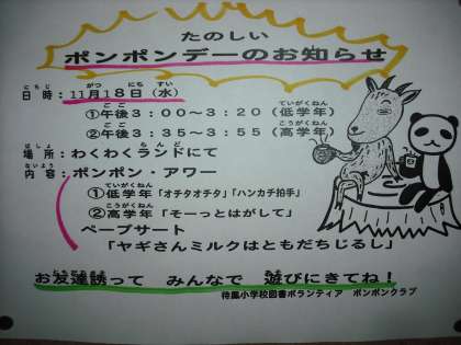 「読書週間が始まります」でお知らせしましたように,11月18日,図書ボランティアさんの「ポンポンデー」が行われます。