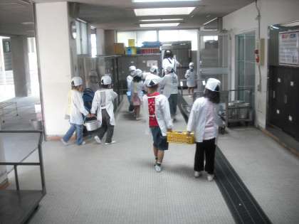 今日は自分たちで準備です。給食室で手を消毒。みんなで給食調理員さんに「いただきます」を言ってから,教室まで運びます。教室ではうまく配膳できました。