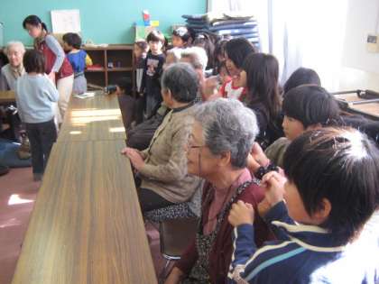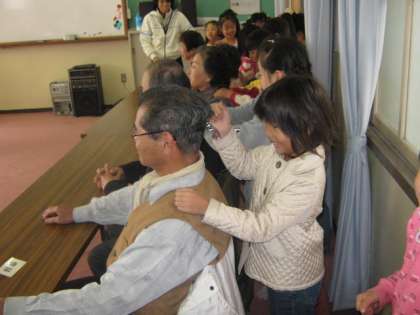 今日の「すこやか学級」は2年生の担当です。学芸会で歌った「チームアース」をはじめ3曲の歌を聞いていただきました。そのあと参加されている皆さんに肩たたきをしてさしあげました。「あ〜気持ちええわ」と言っていただきました。
