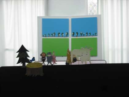 今日は図書ボランティアさんが開いてくれる,たのしい「ポンポンデー」です。ゲームの後,「ヤギさんミルクはともだちじるし」の絵本をペープサートで演じていただきました。子どもたちは真剣に聞いています。お話の中にスーッと引き込まれていきます。