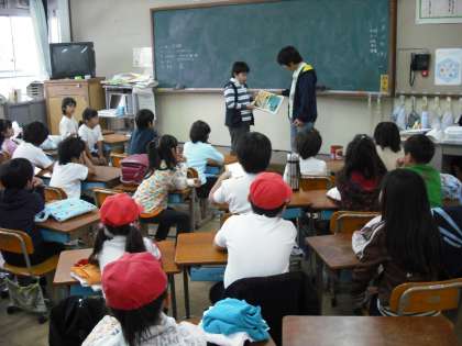 今週は読書週間です。今日の朝読書の時間に図書委員会による読み聞かせがありました。1〜3年生の各教室に出かけて,自分たちで選んだ絵本の読み聞かせをしました。どの教室でも真剣に聞いていました。