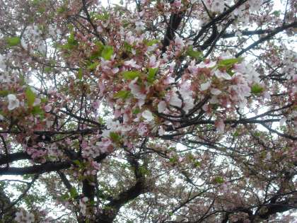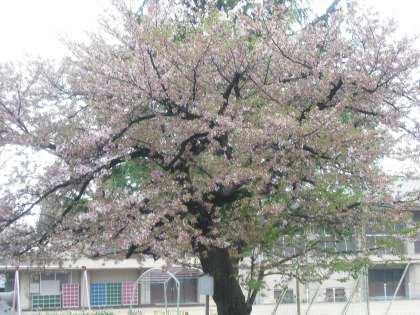 おはようございます。久しぶりの雨でいいお湿りになりますが,桜にとっては残念な雨になりそうです。4月14日,午前7時30分の桜の様子です。ソメイヨシノは終わりに近くなってきました。雨で花びらがずいぶん落ちています。枝垂れ桜も緑の葉が出てきました。