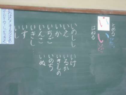 国語の時間にひらがなの勉強をしました。「い」のつく言葉をいっぱい考えたよ。発表も約束を守ってしっかりできました。