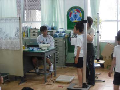 どれくらい伸びたかな?身長・体重・座高を計りました。この計測で,自分に合った机・いすの高さも調整します。