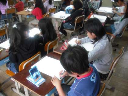 鏡に映った自分の顔をしっかり見ながら描きました。自分の特徴がしっかりあらわせたかな?