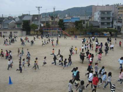 12月8日の「かもがわマラソン]に向けて,今日の中間休みから業間マラソンが始まりました。運動場のトラックの内側を低学年,トラック上を中学年,トラックの外側を高学年が走ります。マラソンまでの2週間,がんばって走りたいと思います。