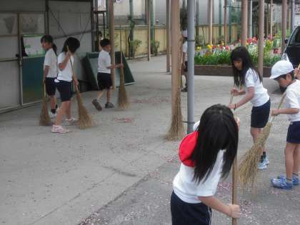 3年生,校庭の掃除時間の様子です。桜の花びらのじゅうたんが出来上がっています。今はきれいなのでもったいない気もしますが,きれいに掃除しています。