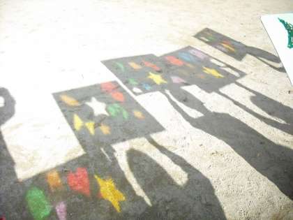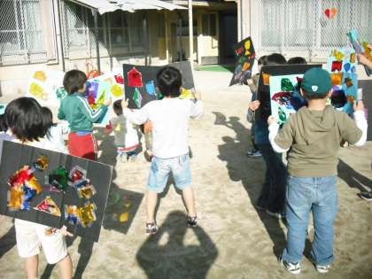 図工で作った「ひかりのおくりもの」を実際に太陽にかざしてみました。いろいろな形が素敵な色で映し出されました。。「わあ,きれい!」の歓声が一斉にあがりました。