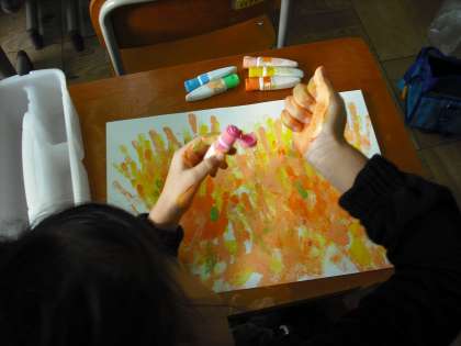初めて絵の具を使って,自分の手でかたおしをしました。手のひらや指などいろんな所を使って,楽しい形が出来上がっていきます。次の時間は野菜など特徴のある形を使って「かたおしあそび」をします。どんなのができるか楽しみですね。