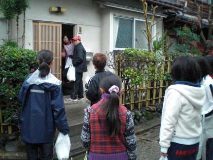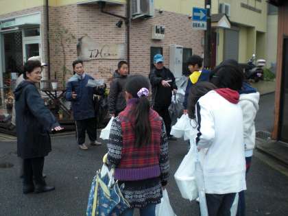 ボランティアの方々と入念に打ち合わせをして,いざ花配りに出発!ちゃんと受けとってもらえるかな。