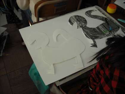 こんな生き物がいたら楽しいだろうなと想像しながら版を作っています。題材は恐竜です。紙やほかの材料を切ったり,ちぎったりしながら貼っていき,自分の想像を拡げています。
