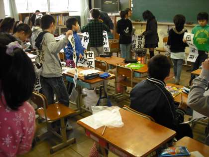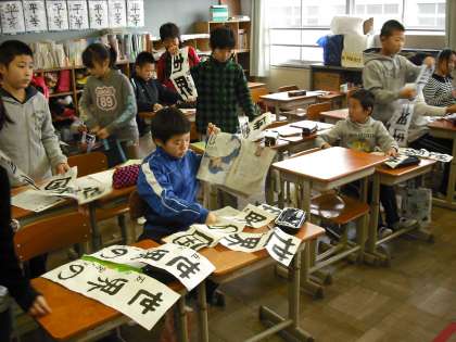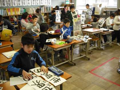 教室で,冬休みの課題を集めました。書き初めでは,友だち同士で作品を見せ合いながら選んで提出しました。