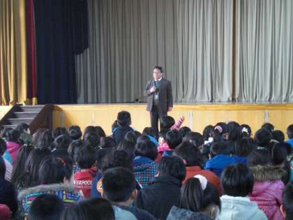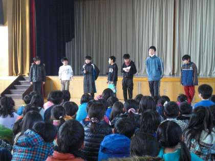 2月の朝会がありました。校長先生から進級・進学についてのお話や冬季オリンピックのついてのお話がありました。引き続き,園芸委員会から植物の種のプレゼントのお知らせや給食委員会から給食週間の取組について発表がありました。