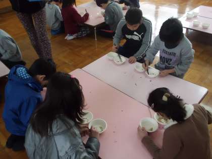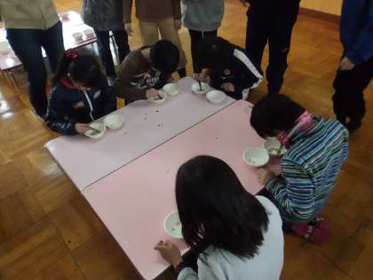 我こそは箸さばきNO.1と自負するクラスの精鋭部隊各10人が1分間で豆をどれだけつかめるか競い合いました。普段使い慣れているお箸と違って,つるつる滑るお箸に子どもたちは大苦戦。はてさて,結果が楽しみです。