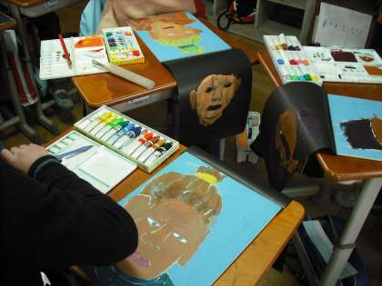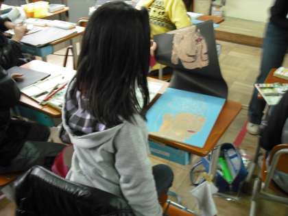 仏像の線彫りが終わり,色刷りにはいりました。黒地の紙に刷っていくので,絵の具の色合いや濃さが難しいです。出来上がりが楽しみです。