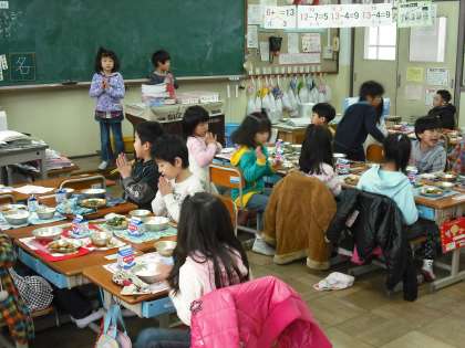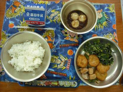 今日の給食に「ぜんざい」がついています。年に1回,お正月につきます。1年生にとっては初めての「ぜんざい」です。みんな食べるのをとても楽しみにしています。