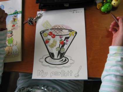 今日はALTのセバスチャン先生と一緒に,自分たちの作った「フルーツパフェ」を紹介するゲームをしました。ストロベリー・キーウィ・バナナ・オレンジなど,フルーツの発音に気をつけて,紹介している人のパフェはどれか当てます。みんな自分のパフェのフルーツをしっかり覚えて,がんばって紹介しました。