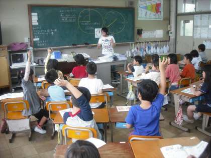 新学習指導要領の移行措置による算数の学習です。今までは3年生で学習する内容です。文部科学省より配布された補助教材を使って学習しています。後ろの掲示板から,お友だちが頑張って学習している様子を見ています。