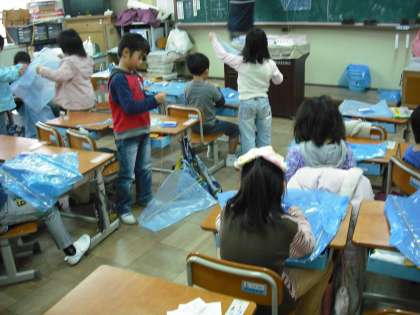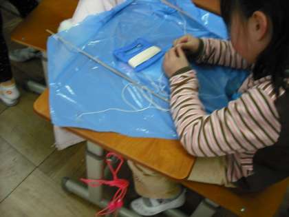 今日はビニール袋をつかって,たこづくりです。新聞紙の型紙をビニール袋にうつして切りとります。竹ひごをつけると,たこのできあがりです。この後,たこに自分の好きな絵を描いていきます。うまく上がるたこができるかな。