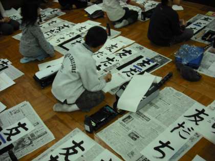 ちょっと遅くなりましたが,書初めをしました。心を落ち着かせて,「友だち」を書いていますが,初めて画仙紙に書く子どももいて,バランスをとるのが難しいようです。友だちのことを考えながら書けたかな。