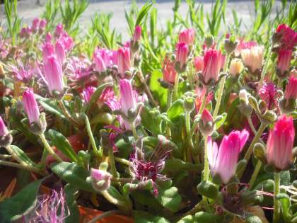 リビングストンデージーの朝7時30分と10時30分の様子です。今朝は肌寒かったせいか,花がすぼんでいます。陽射しをうけ,気温が上がってくると一気に花びらをひろげました。植物は自分を守ることをしているのですね。ちなみに,この花の名前はイギリスの探検家「リビングストン」に由来したものだそうです。