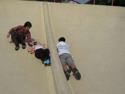 仲よし学級で「お皿公園」と呼んでいる「上堀川児童公園」に行ってきました。大きなすりばちのような滑り台で「わーわー,キャアキャア」おおはしゃぎでした。とても楽しかったよ。また行きたいなあ〜。