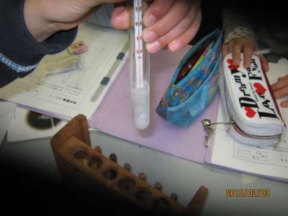 温度によって水が固体や液体に変化することを,実験で調べました。くだいた氷に食塩を入れ,水の凍り方を調べました。またとける様子も調べ,氷と水がある状態では0度であることもわかりました。