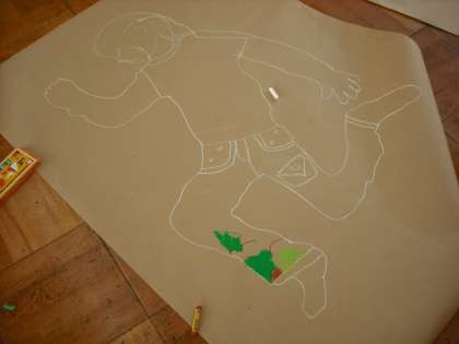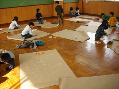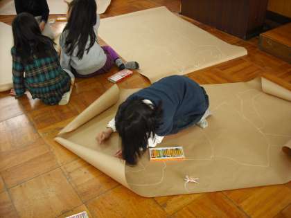1年生では図工展に向けて等身大の運動している自分の姿を描いています。今日は,大きな紙の上に,走ったり縄跳びをしたりしている姿で寝そべってなぞっていきました。どんな自分ができるか楽しみですね。
