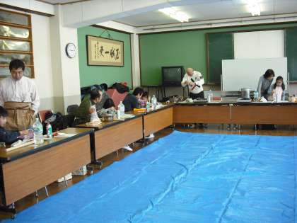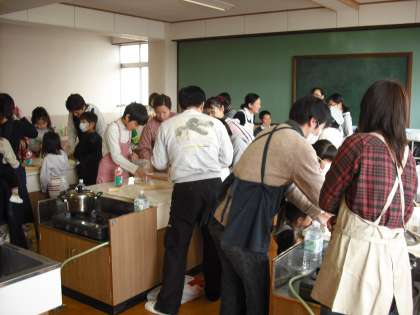 今日はおやじの会主催「うどん作り」です。親子で参加して,力を合わせて作ります。粉は,うどんの本場讃岐より取り寄せています。まず,粉に塩水をまぜて,だまがなくなるように混ぜています。