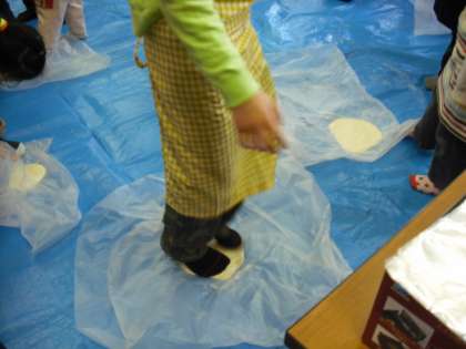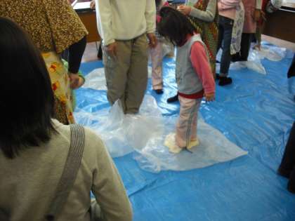 混ぜ終わったら,今後は「こし」を出すために踏みの作業です。踏めば踏むほど「こし」のあるうどんが出来上がります。がんばれ〜!踏み終わったらしばらくあたたかいところで寝かせます。