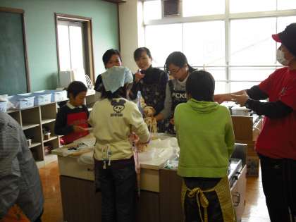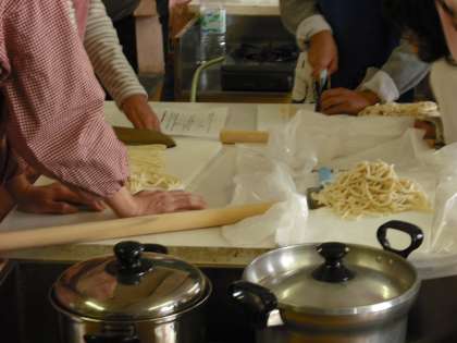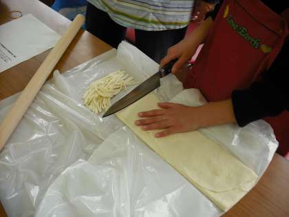 麺棒で延ばした後,折りたたんで細く切っていきます。同じ太さに切れるかな?切った後,昼食として食べる分をゆがきます。