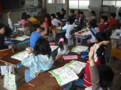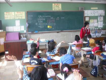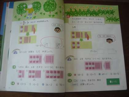 「計算のしかたをかんがえよう(たし算・ひき算)」の勉強です。今日は(二位数+一位数)のたし算です。みんな頑張っています。この学習は,来年度から1年生に移行して,1年生が学習します。