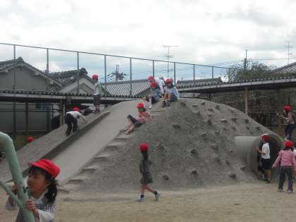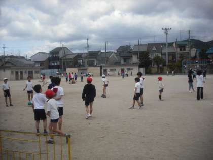 運動場が「元気」であふれています。写真で見る以上にたくさんの子どもが遊んでいます。1年生は赤帽をかぶって遊んでいます。築山が大好きです。待鳳小学校のみんな,とても元気です。