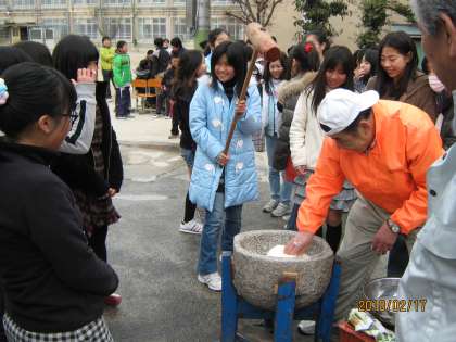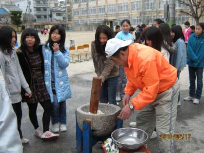 いよいよもちつきの開始です。朝早くから,多くの地域の方々やPTA・保護者の皆さんにお世話になって,準備していただいたもち米も蒸しあがり,これからついていきます。6年生一人ずつにつかせていただきました。お餅を食べたことはあっても,ついたことがない子どもたちがほとんどです。杵を持つ手もふらつきながら,ついていました。自分でついたお餅の味はどうでしょうか。