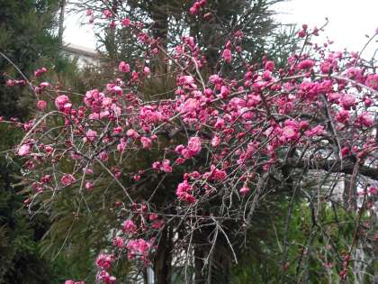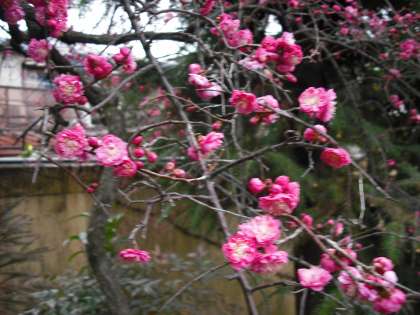 おはようございます。梅だよりではありませんが,枝垂梅がどんどんと咲き始めました。紅梅のピンクが引き立っています。