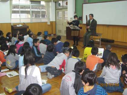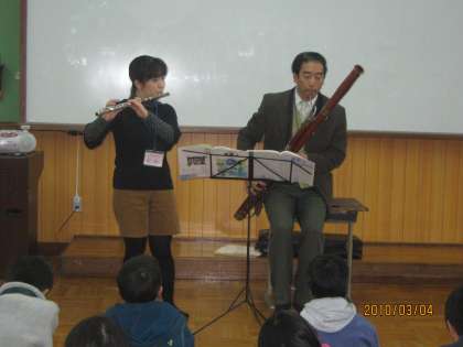 教科書で学習した木管楽器の実際の音色を,生演奏で鑑賞しました。6年の音楽のスクールサポーター埜上先生のフルートと教頭先生のファゴットで,教科書の曲やジブリメロディーなどを二つの楽器のデュエットで聴きました。CDとはちがう生演奏のよさを味わいました。