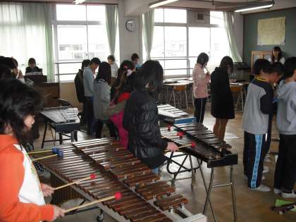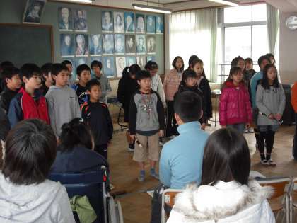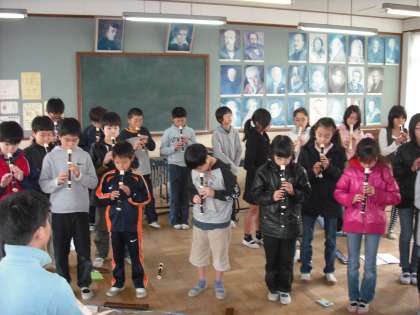 5年1組では,来年度,最高学年になる心がまえを考えるために話し合いを持ち,音楽コンサートを開くことにしました。題名は心と心のつながりを大切にするために「絆」としました。保護者のみなさんや教職員が見守る中,歌やリコーダー,器楽合奏を頑張りました。この一年間を振り返って,来年は全校の見本となるような6年生になってください。