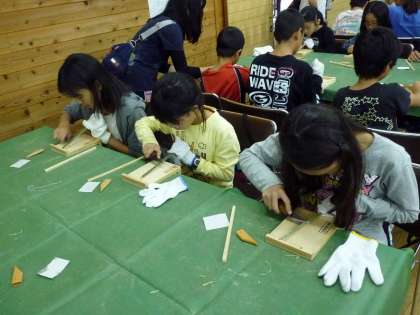 昼からは、まず、竹のお箸を作りました。小刀で竹を削り、一人ひとり自分のお箸を作りました。小刀を使うのは初めての子供たちも多く、なかなか大変そうでしたが、みんな、なんとか自分のお箸ができました。今日の夕食から、このお箸で食事を食べます。