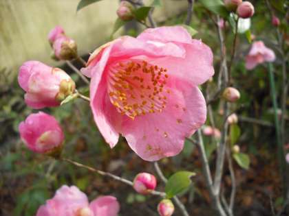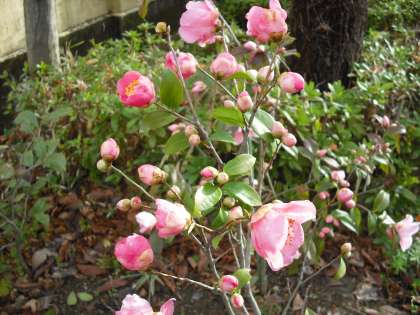3月に入り,つぼみが膨らんでできたツバキが咲いています。ピンクのかわいい花が咲いています。