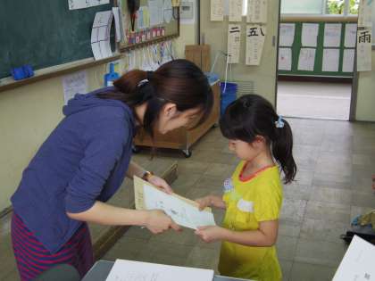 そして,1年生は初めての通知表渡しです。ドキドキしながら通知表を見ていました。